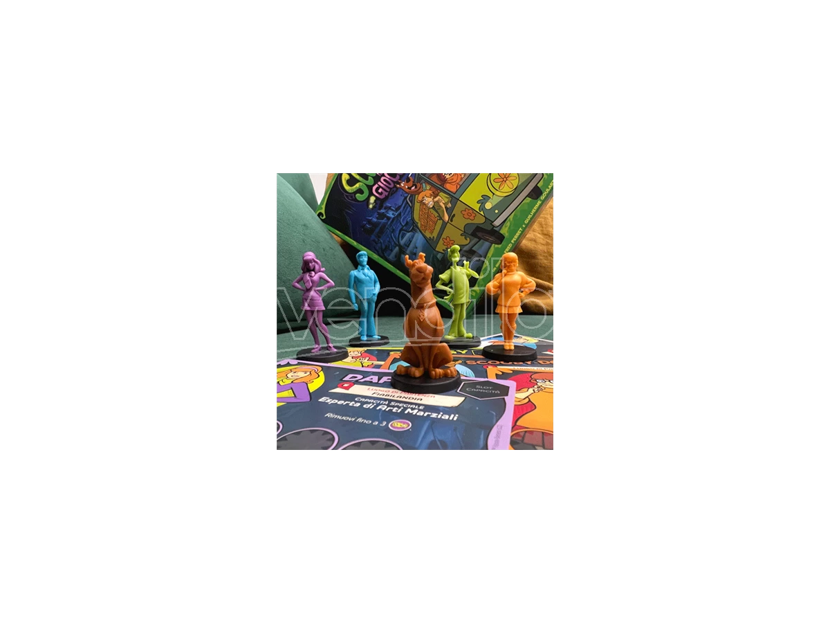 Contenuto: 1 Tabellone Città, 5 Miniature Banda di Scooby, 1 Mystery Machine, 3 Miniature Mostro, 9 Carte Identità, 30 Carte Banda di Scooby, 12 Carte Mostro, 18 Carte Trappola, 85 Segnalini, 1 Regolamento.