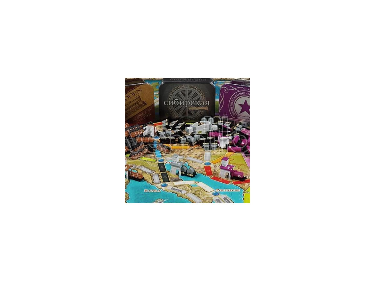 Contenuto: 1 mappa gigante delle tratte ferroviarie europee con nuove illustrazioni, 5 scatole di latta, ciascuna contenente 45 Vagoni finemente dettagliati, 15 Stazioni ferroviarie colorate, 5 segnapunti, 1 Regolamento, 110 carte Treno, tutte le 108 carte Biglietto Destinazione pubblicate fino ad oggi, 1 carta bonus European Express e 1 carta Grandi Città d’Europa.