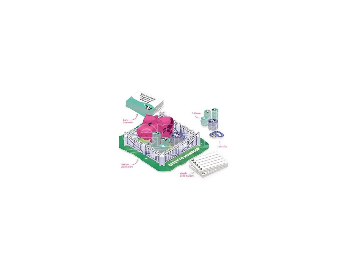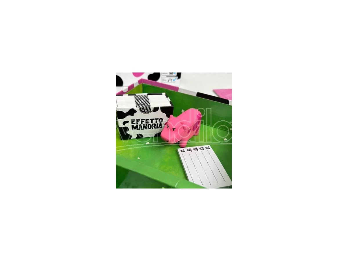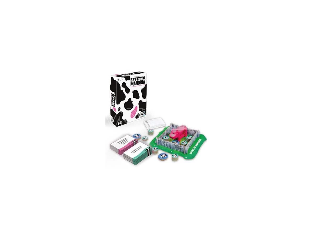 Contenuto: blocchi delle risposte, carte domanda, segnalini mucca, mucca rosa morbidosa, recinto per mucche.