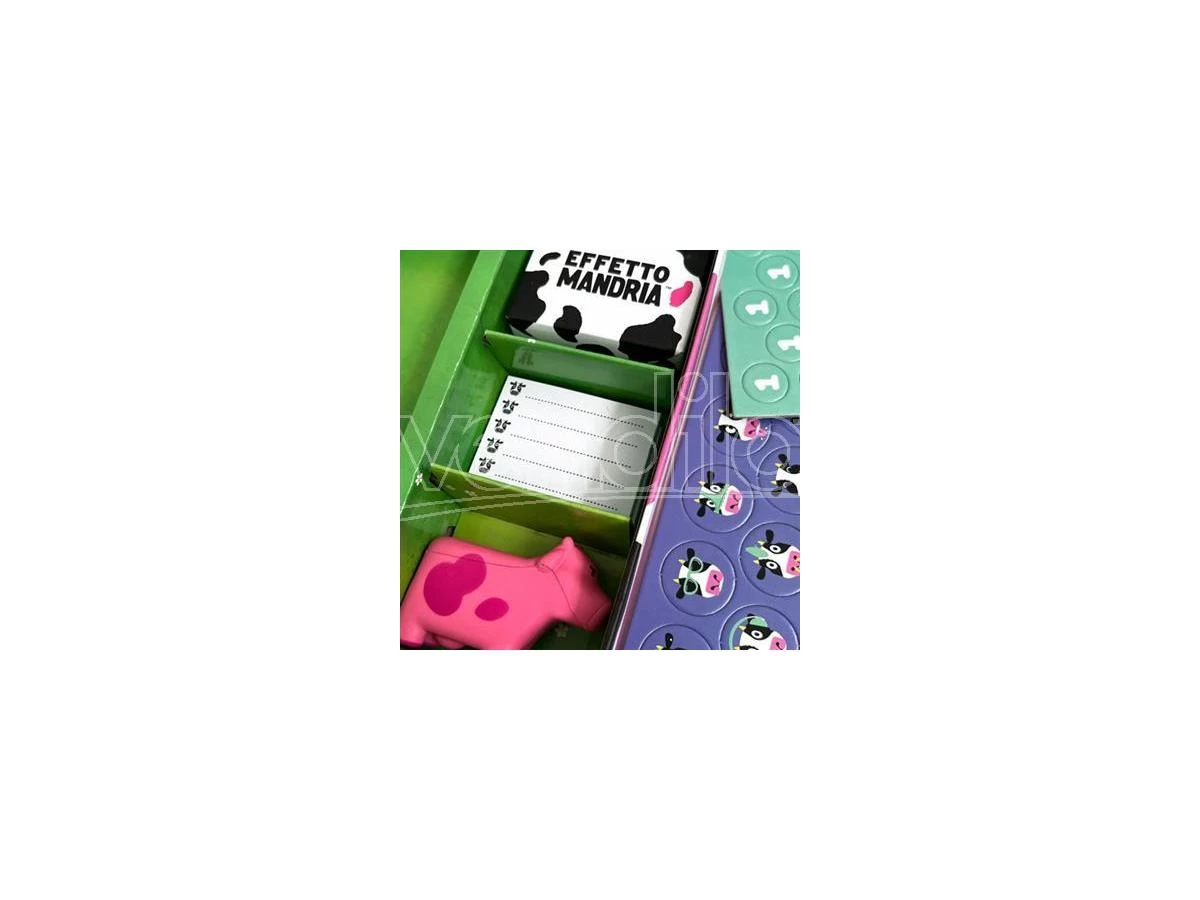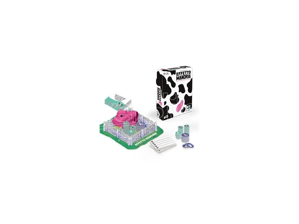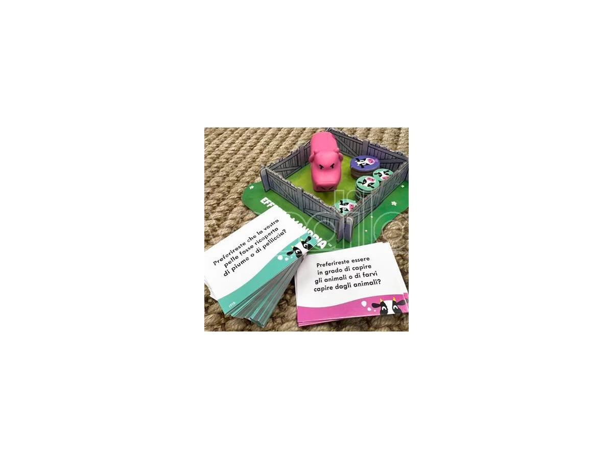 Contenuto: blocchi delle risposte, carte domanda, segnalini mucca, mucca rosa morbidosa, recinto per mucche.