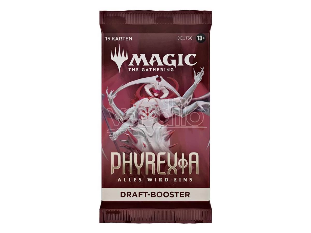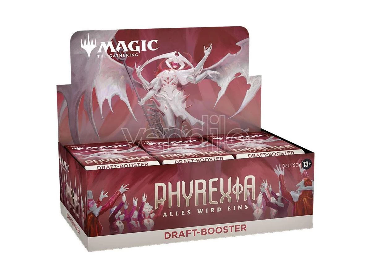 The Phyrexia: All Will Be One Draft Booster Box contiene 36 Phyrexia: Tutto sarà un unico draft booster. Ogni Draft Booster contiene 15 carte e 1 pedina/carta pubblicitaria, inclusa 1 carta di rarità Rara o superiore e 3 Non comuni, 10 Comuni e 1 Terra. Planeswalker mitico senza bordi in lamina tradizionale in